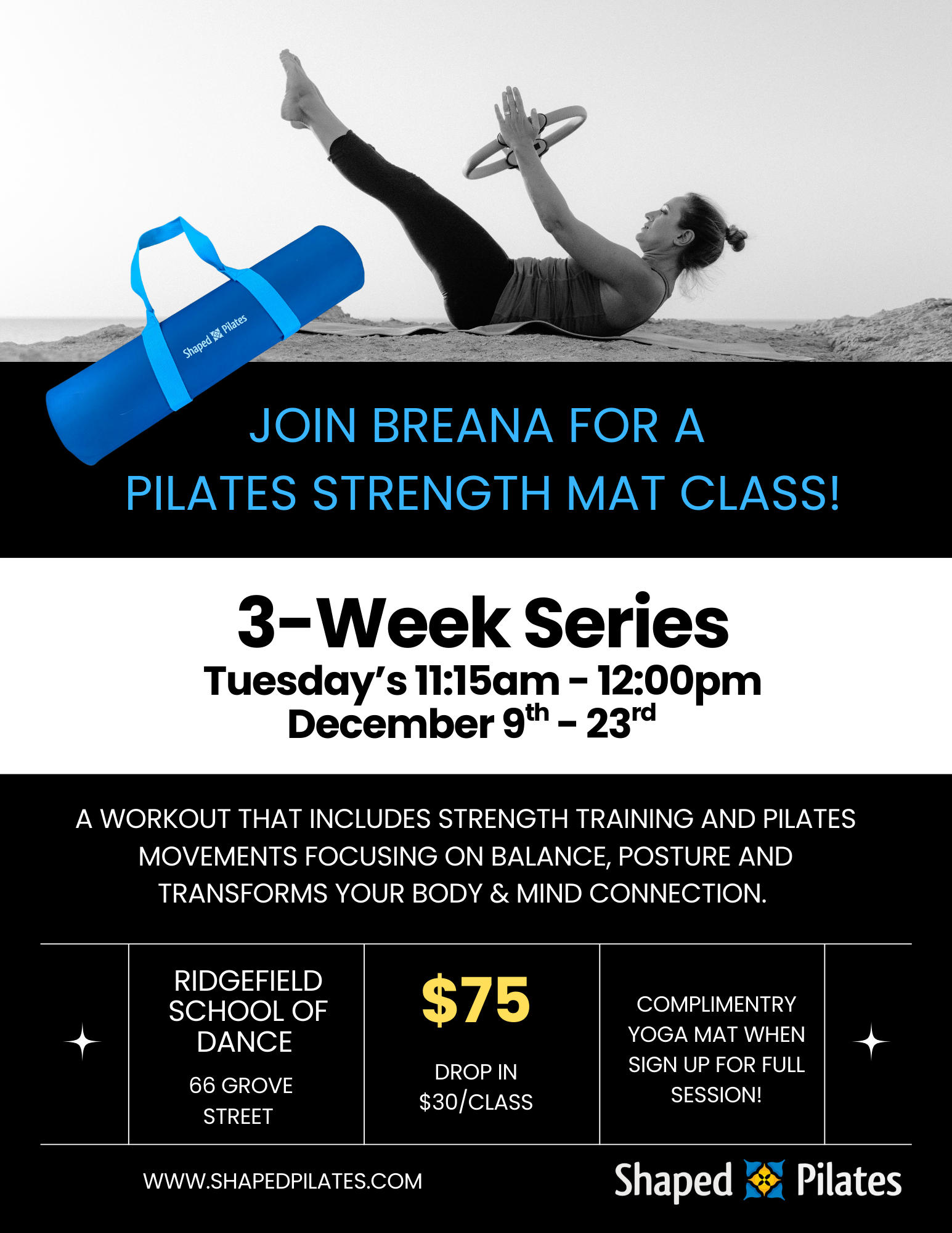 Join Breana for a 3-week Pilates Strength Mat class at Ridgefield School of Dance! A 45- minute workout that includes strength training and Pilates movements focusing on balance, posture and transforms your body & mind connection.